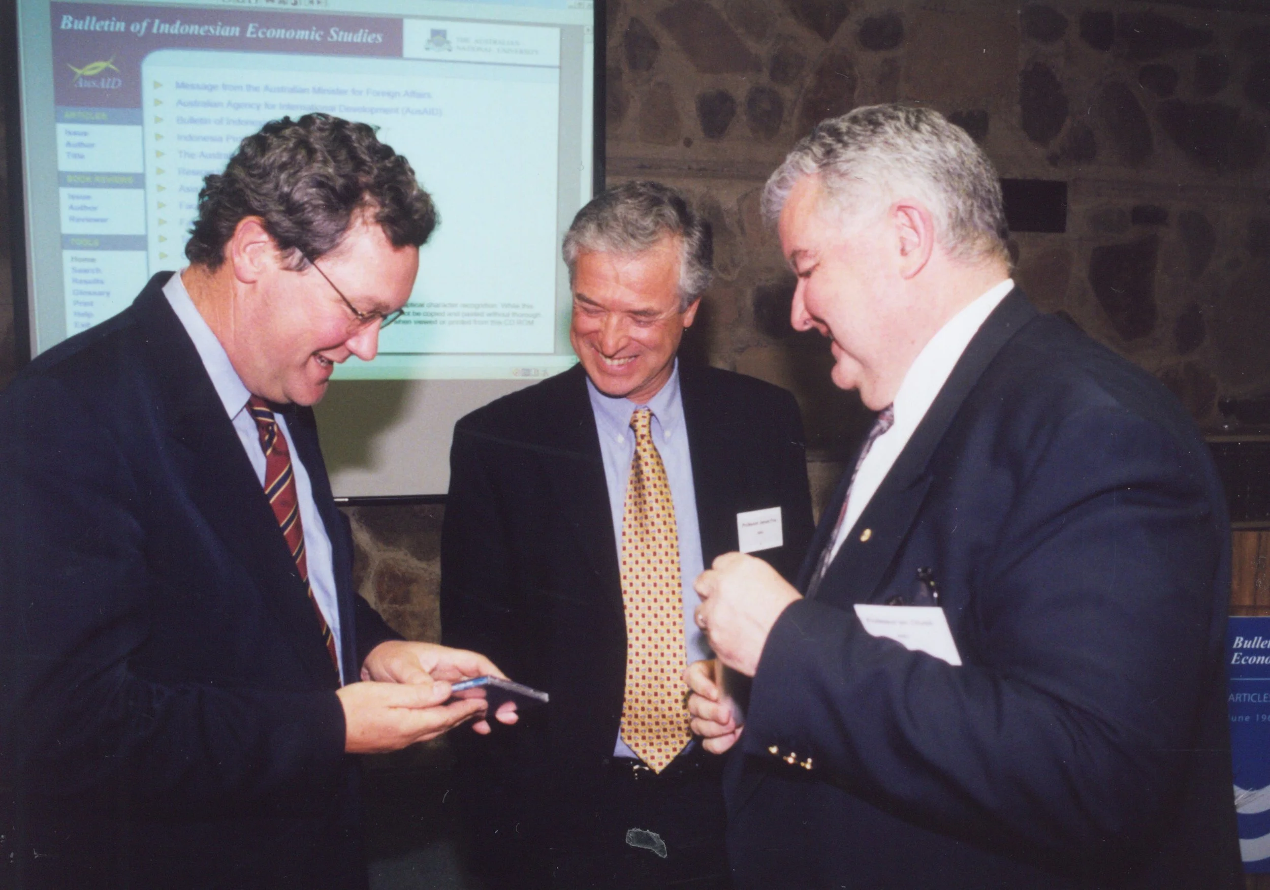 Book presentation of the 2003 Indonesia Update book showing Ambassador of Indonesia Imron Cotan, Pierre van der eng and Ross Garnaut.