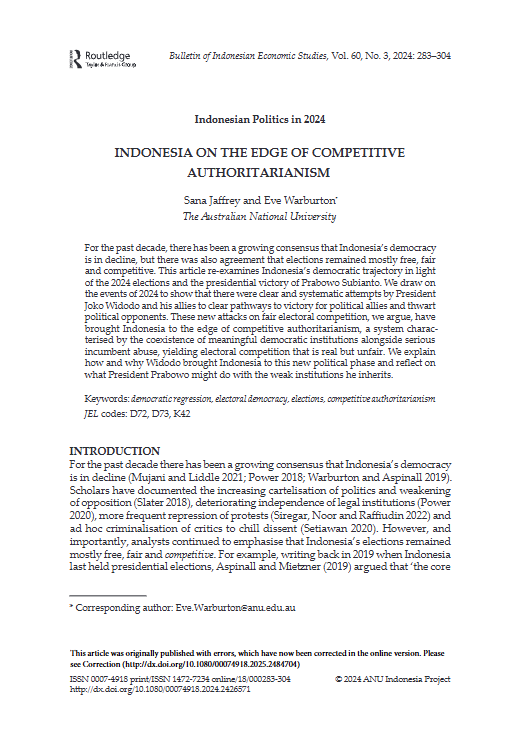 A highlight of the annual Indonesia Update conference is the political update, which explores recent political trends in Indonesia. The political update is published in the December issue of the BIES. The research paper is widely used as a reference for Australians, Indonesian and policy makers to learn more regarding current political issues in Indonesia.